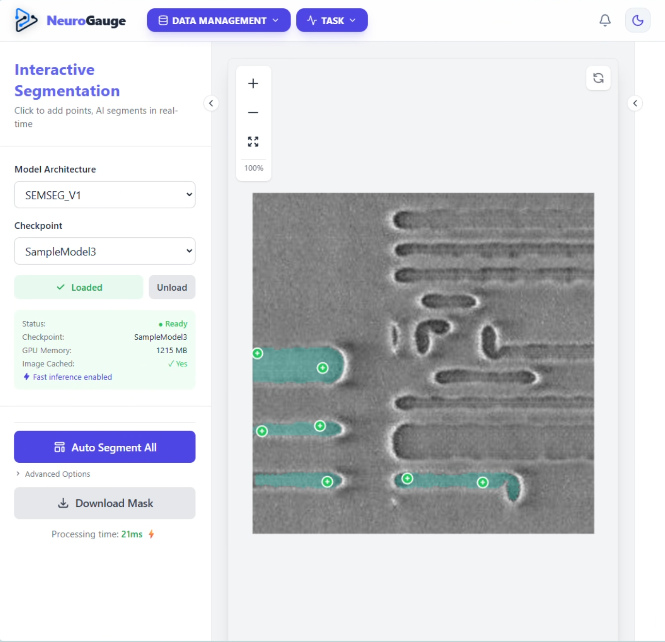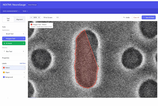 SEM 이미지 내 패턴 정밀 추출 및 설계 도면·레퍼런스 이미지와의 자동 정렬을 지원합니다.